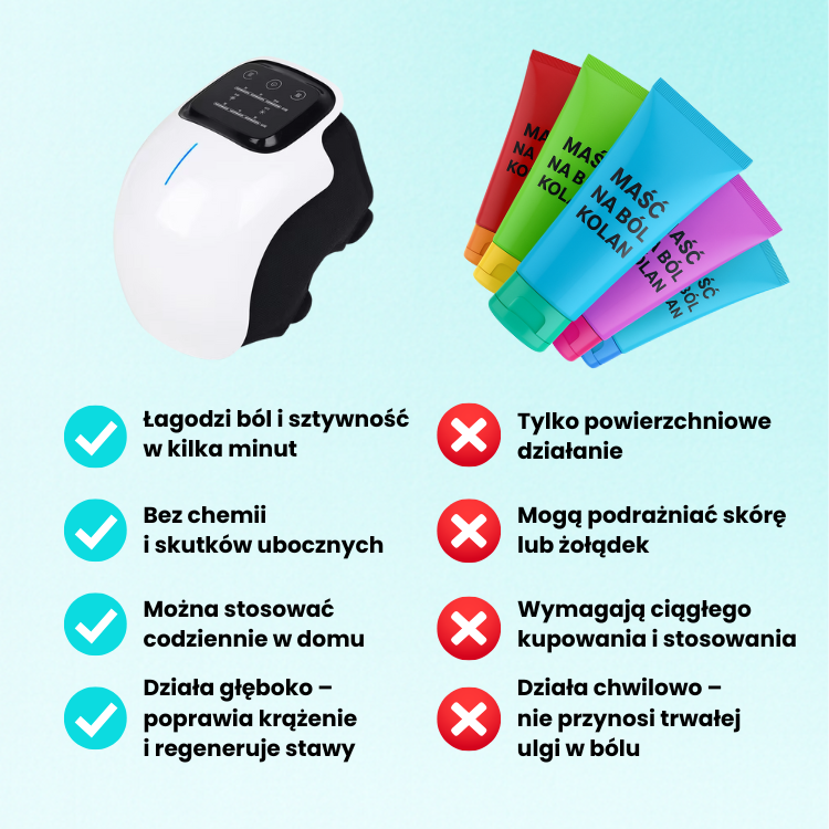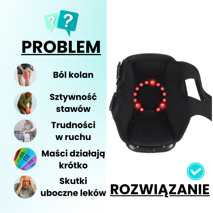 To innowacyjny masażer, który łączy w sobie działanie ciepła, wibracji, podczerwieni i lasera, aby skutecznie łagodzić ból, sztywność i napięcie stawów. Dzięki ergonomicznemu kształtowi idealnie dopasowuje się do każdego kolana, zapewniając maksymalny komfort i efekty terapii.